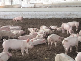 環境隔離型のウィンドレス式の離乳豚舎育成および肥育期の豚の飼育環境は、土着微生物を生かした発酵床にて飼育しています。
