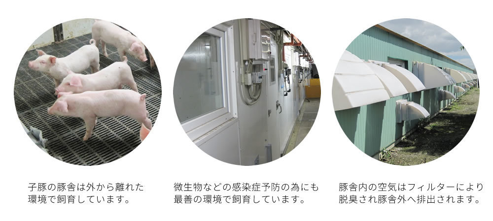 子豚の飼育環境はストレスを最小限にすることと、周辺環境を考慮した離乳豚舎で飼育しています。子豚に最適な環境を常に維持するとともに、周囲へ匂いの影響を出さないようにしています。