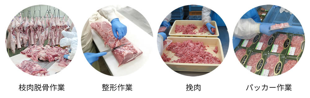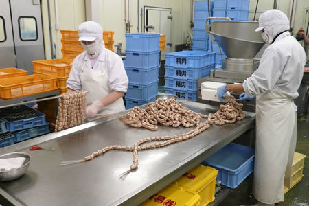 屠畜直後の温かい豚肉を温屠体といいます。屠畜してから8時間以内に豚肉を挽肉にして、 さらに練り上げてペースト状にしたものをウインナーの原料に加えています。 弾力のあるウインナーを作ることができます。 |