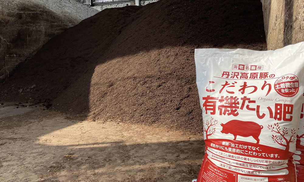 豚を肥育する環境の下で使用していた剪定枝を発酵・乾燥させ、堆肥を生産しています。近隣の野菜生産者や有機野菜の認定生産者へ、化学肥料含まない堆肥として提供しています。